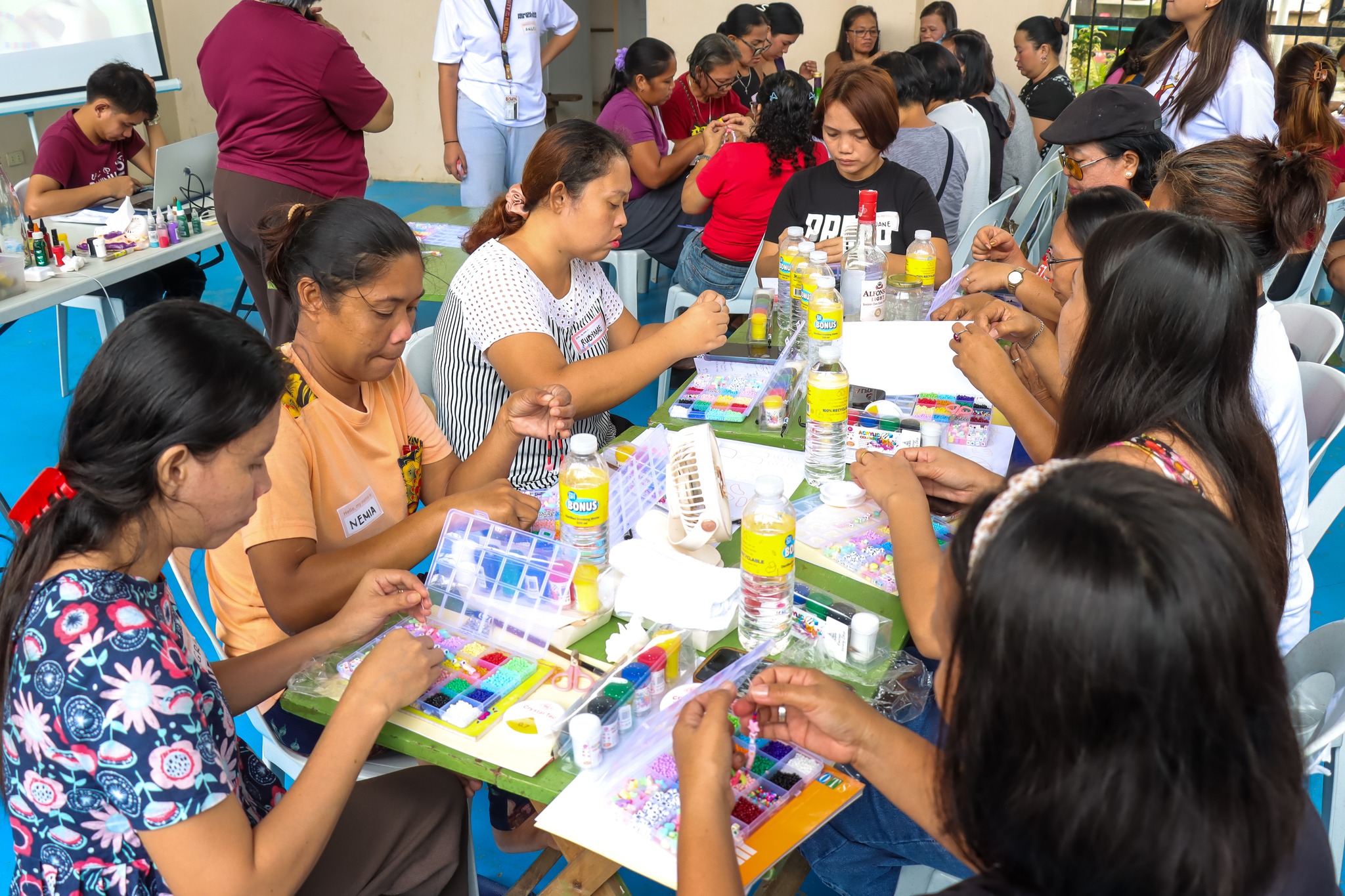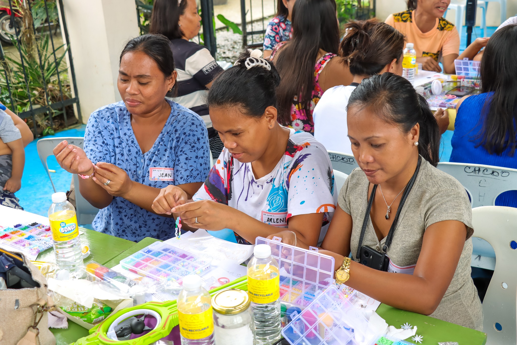Forty-seven women from Yolanda resettlement sites participated in the sustainable livelihood and enterprise development workshop on wine bottle design and bracelet making led by Division of Management faculty members and Division chairperson Asst. Prof. Anida Bernadette Lorenzo.