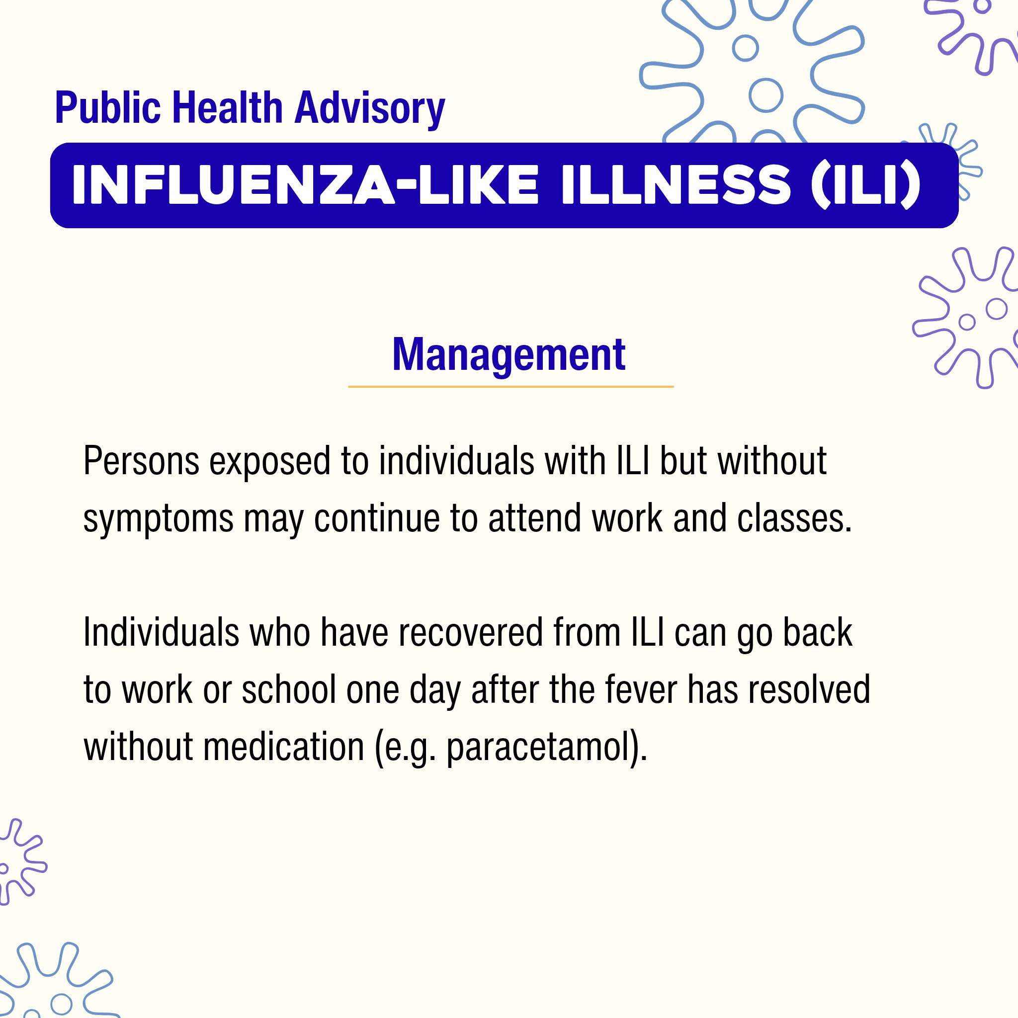 Individuals who have recovered from ILI can go back to work or school one day after the fever has resolved without medication (e.g. paracetamol).